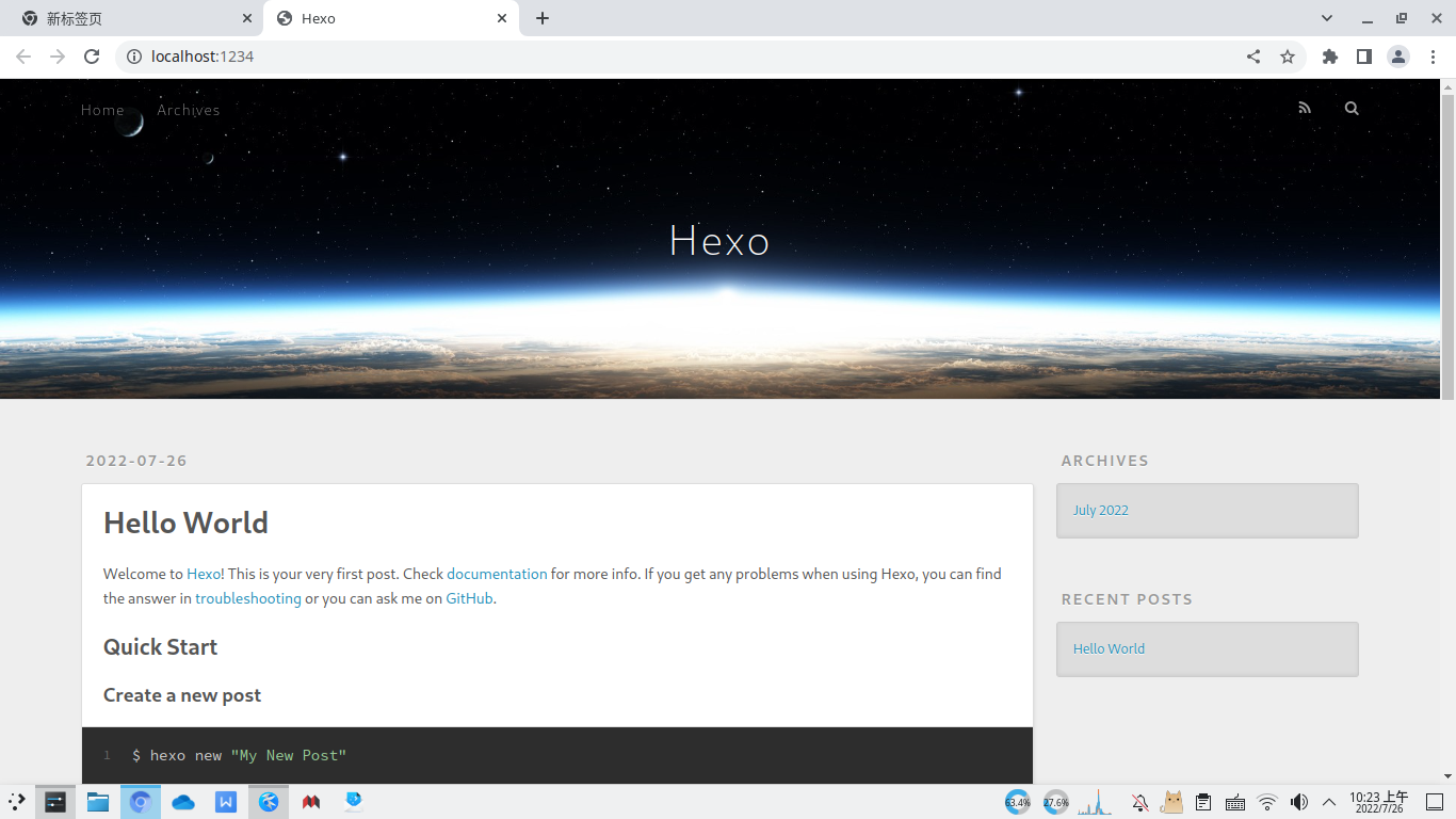 在开始配置之前,先来试一试吧!你将看到默认主题 landscape 下的 helloworld 文章。1