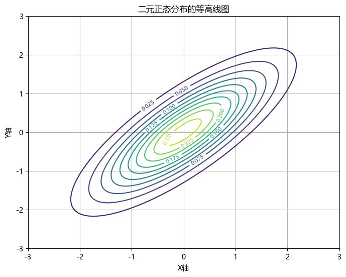 上图是 \(\Sigma = \begin{bmatrix}1&0.8\\0.8&1\end{bmatrix}\) 的等值线图。